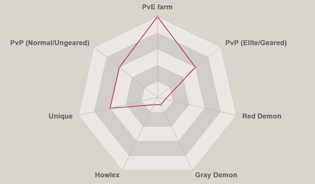 - L’attaque AoE la rend idéale pour le farming en JcE au début de la phase de progression.