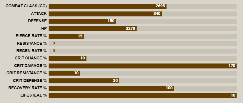 | Inflicts damage equal to 455 / 501 / 546 / 592 / 637 / 683% of Attack on one enemy. Makes target Bleed for 2 turns. | |