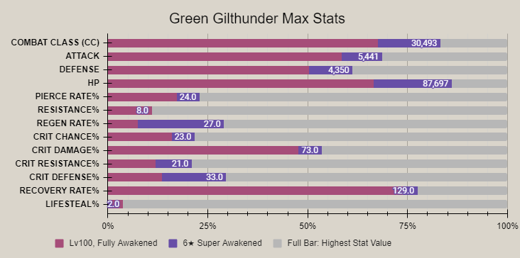 PvP - Green Gilthunder has some usefulness in normal (ungeared) PvP. He can still be useful in elite (geared) PvP, although less so than ungeared PvP. His primary usefulness with relation to PvP is from the sub-slot since his Unique ability is passive and increases the Defense-related stats of all allies in PvP without requiring him to be in combat.