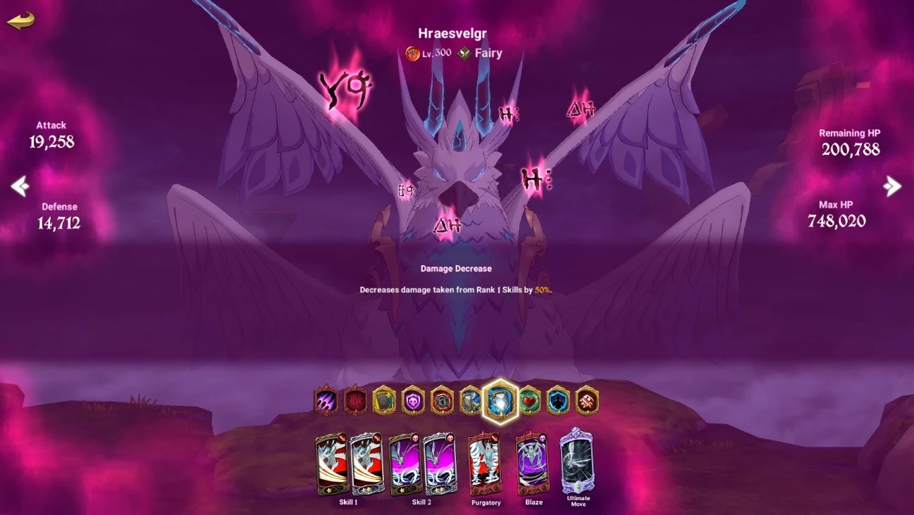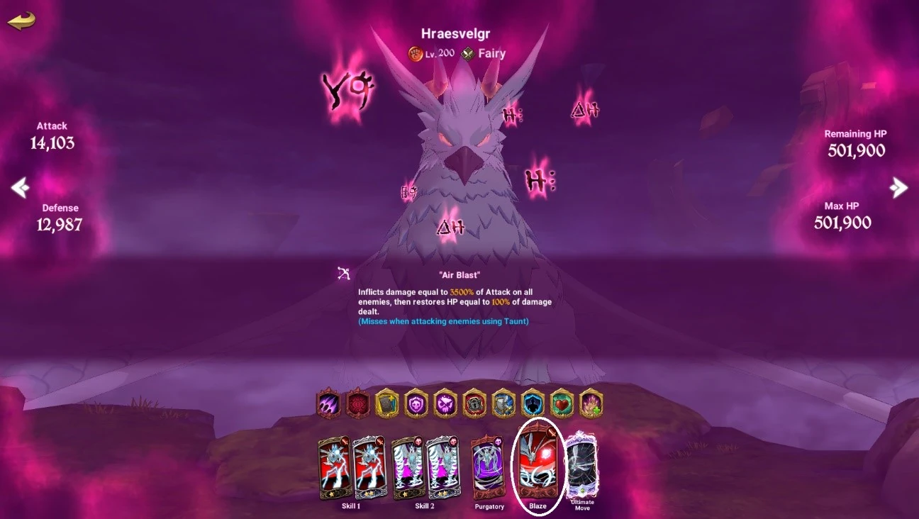Besides that, attack the boss like normal while maintaining your Taunt. If you find yourself not gaining any good Attack skills, you can stall on any of the earlier phases to buy yourself some extra time to gain them or a strong Ultimate. If using Blue Megellda, remember to use her Recovery skill to grant Buffs to allies.